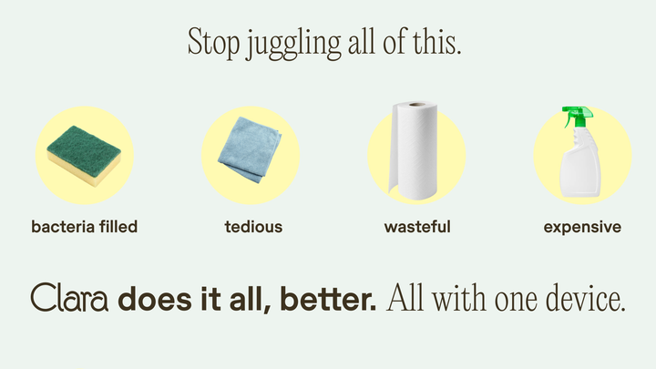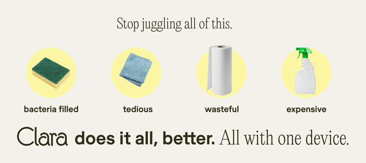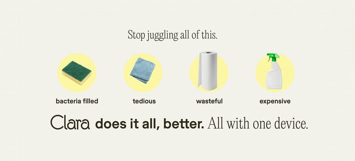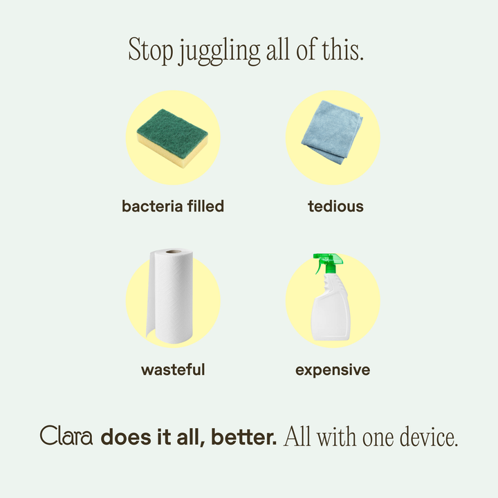 Ditch wasteful paper towels, bacteria filled sponges, cumbersome spray bottles, and outdated rags. Clara does it all better, with the touch of a button.